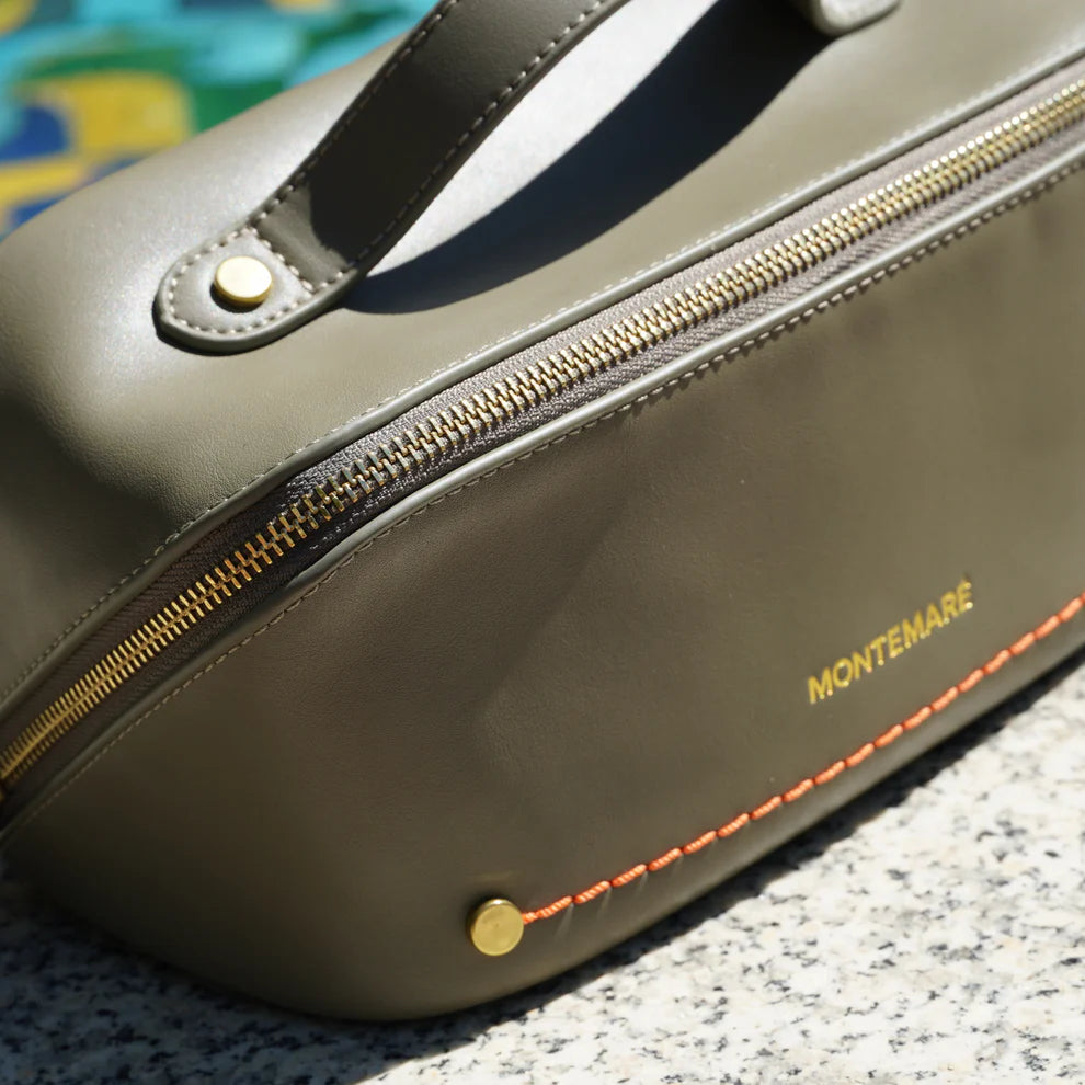 Designed for effortless grab-and-go convenience, this toiletry bag features an expandable zippered opening that provides easy access and visibility for your larger essentials. Inside is a water-resistant lining to protect against spills, and is easily cleanable. It is thoughtfully organized with one large zippered pocket on one side and two open pockets on the other, all accented with Montemaré orange vegan leather details. Additionally, the middle divider not only helps keep your items separated, but also provides additional storage space. Perfect for travel or daily use, it combines practical design with luxurious details, making it an essential accessory for the modern traveler.